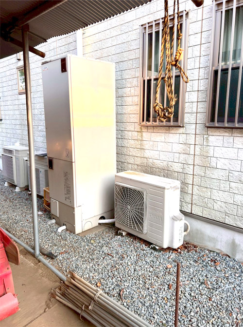 マンションの2階に設置されたエコキュートの交換工事を行いました。