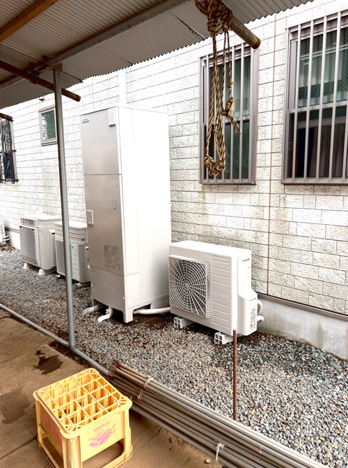 マンションの2階に設置されたエコキュートの交換工事を行いました。